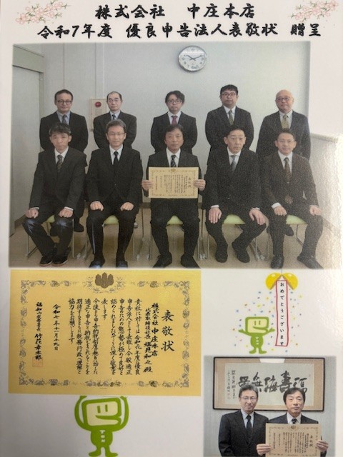 優良申告法人として表敬を受けました 2025.11.24 この度、優良申告法人として表敬を受けました。日頃より適正な申告と納税は、企業の社会的責務であると考え、法令順守の徹底と経理体制の強化に努めてまいりました。その取り組みを評価いただけたことは、私どもにとりまして大きな励みとなります。今後も経営内容の透明性と適正な申告・納税を通じて、社会に信頼される企業として、その責務を果たしてまいります。